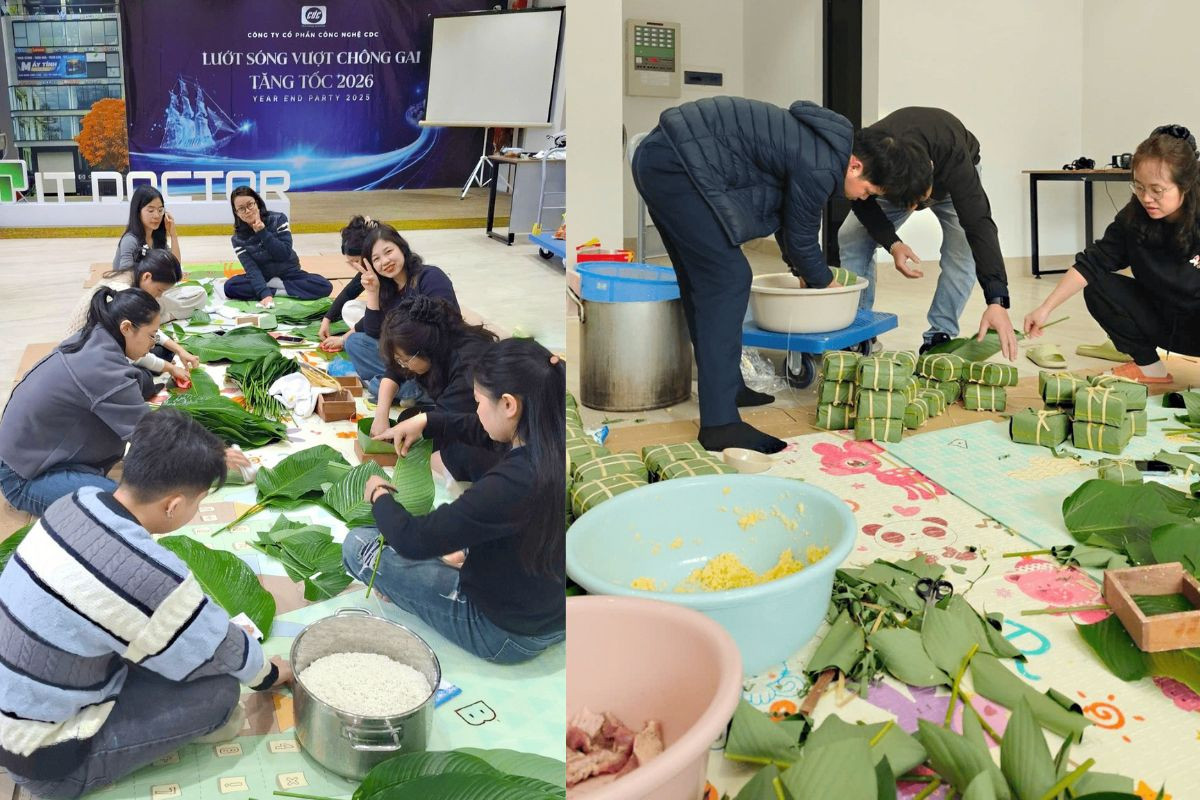 Nếu Year End Party thể hiện tinh thần tăng tốc, thì hoạt động gói bánh chưng cuối năm lại phản ánh chiều sâu văn hóa doanh nghiệp của CDC. Tập thể cán bộ nhân viên cùng nhau chuẩn bị nguyên liệu, gói bánh, nhóm bếp và thức đêm trông nồi bánh.