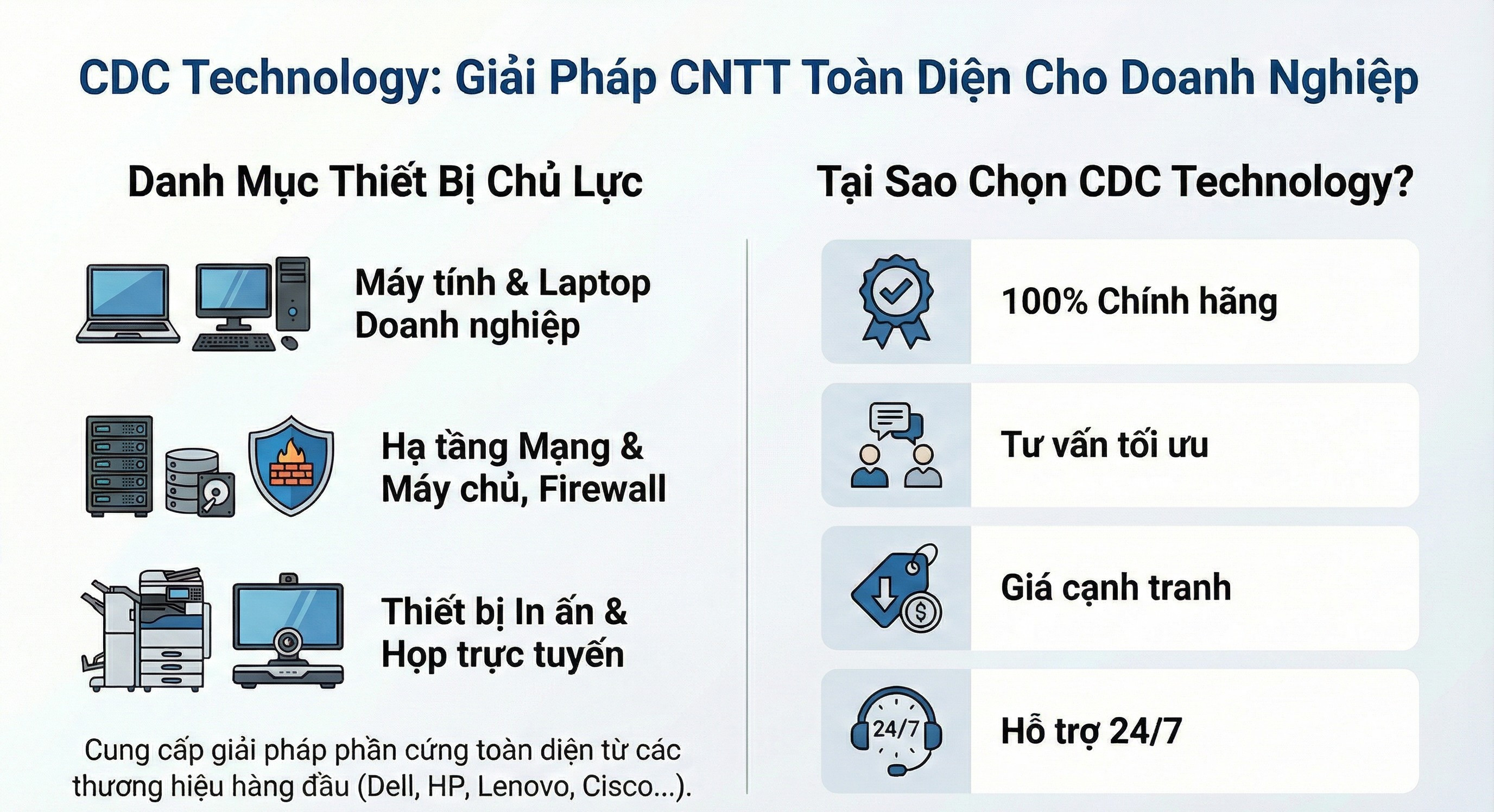 Trong kỷ nguyên chuyển đổi số, hạ tầng Công nghệ thông tin (CNTT) và thiết bị văn phòng đóng vai trò là "mạch máu" quyết định hiệu suất vận hành của mọi doanh nghiệp. Một hệ thống ổn định không chỉ giúp tối ưu hóa quy trình làm việc mà còn là nền tảng để bảo mật dữ liệu và phát triển bền vững. CDC Technologies tự hào là đối tác chiến lược chuyên cung cấp giải pháp thiết bị CNTT tổng thể, đồng hành cùng hàng nghìn doanh nghiệp trong hành trình hiện đại hóa văn phòng.