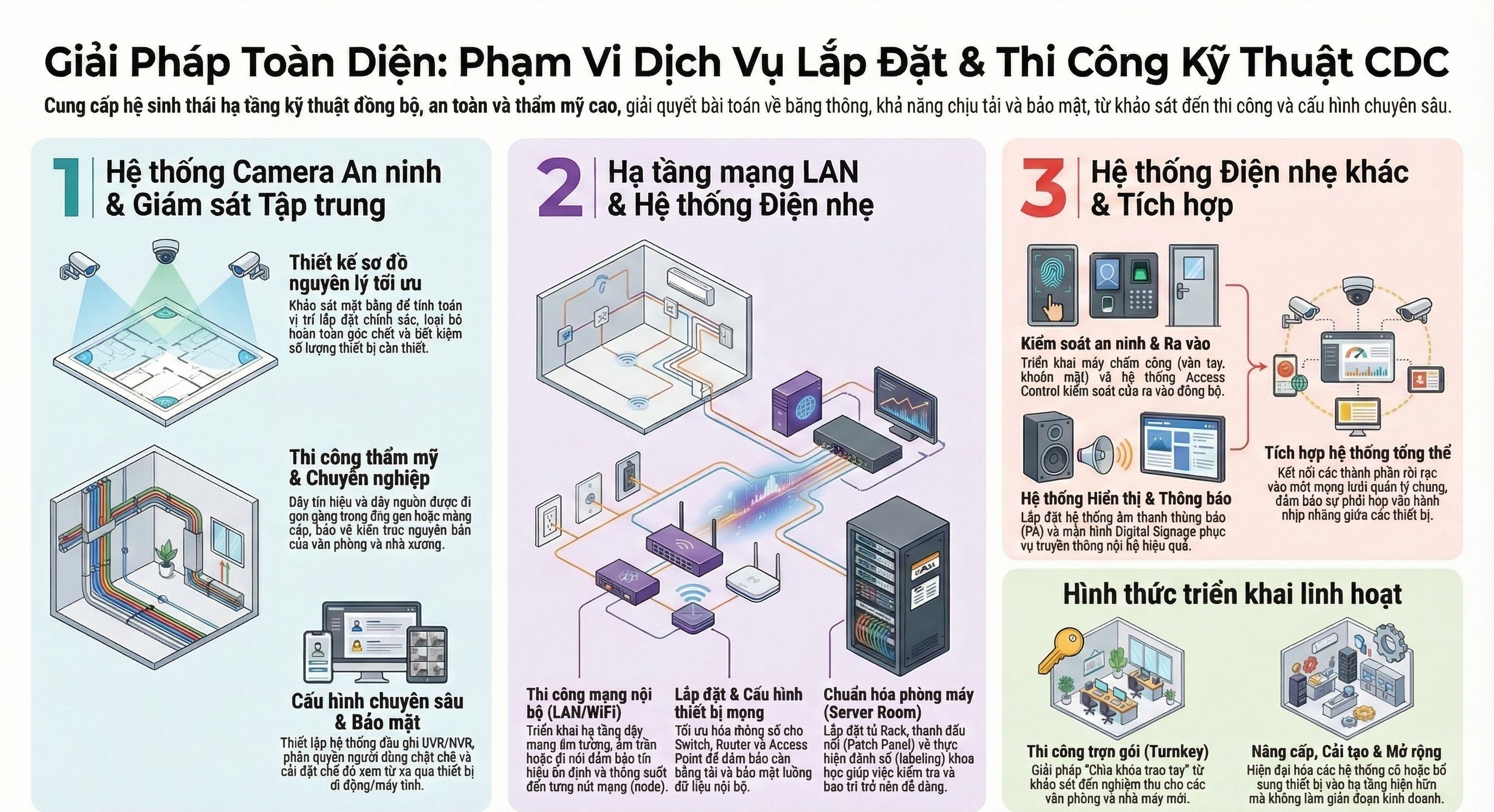 Hệ thống Camera & Điện nhẹ ngày càng giữ vai trò quan trọng trong việc đảm bảo an ninh, hỗ trợ quản lý và duy trì vận hành ổn định cho doanh nghiệp. Tuy nhiên, để hệ thống phát huy hiệu quả lâu dài, việc triển khai cần được thực hiện bài bản, đồng bộ ngay từ khâu khảo sát, thiết kế đến thi công và nghiệm thu. Dịch vụ lắp đặt hệ thống Camera & Điện nhẹ của CDC được xây dựng theo hướng tích hợp tổng thể, phù hợp với từng mặt bằng và nhu cầu vận hành thực tế của doanh nghiệp.
