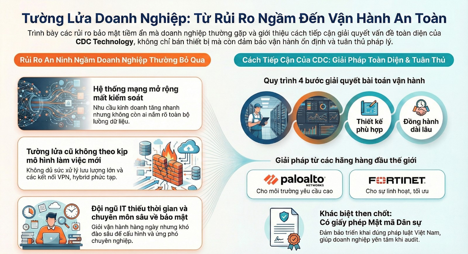 CDC Technologies không tìm cách “lắp firewall mạnh nhất”, mà tập trung vào giải pháp giúp doanh nghiệp vận hành trơn tru và kiểm soát được rủi ro trong nhiều năm.