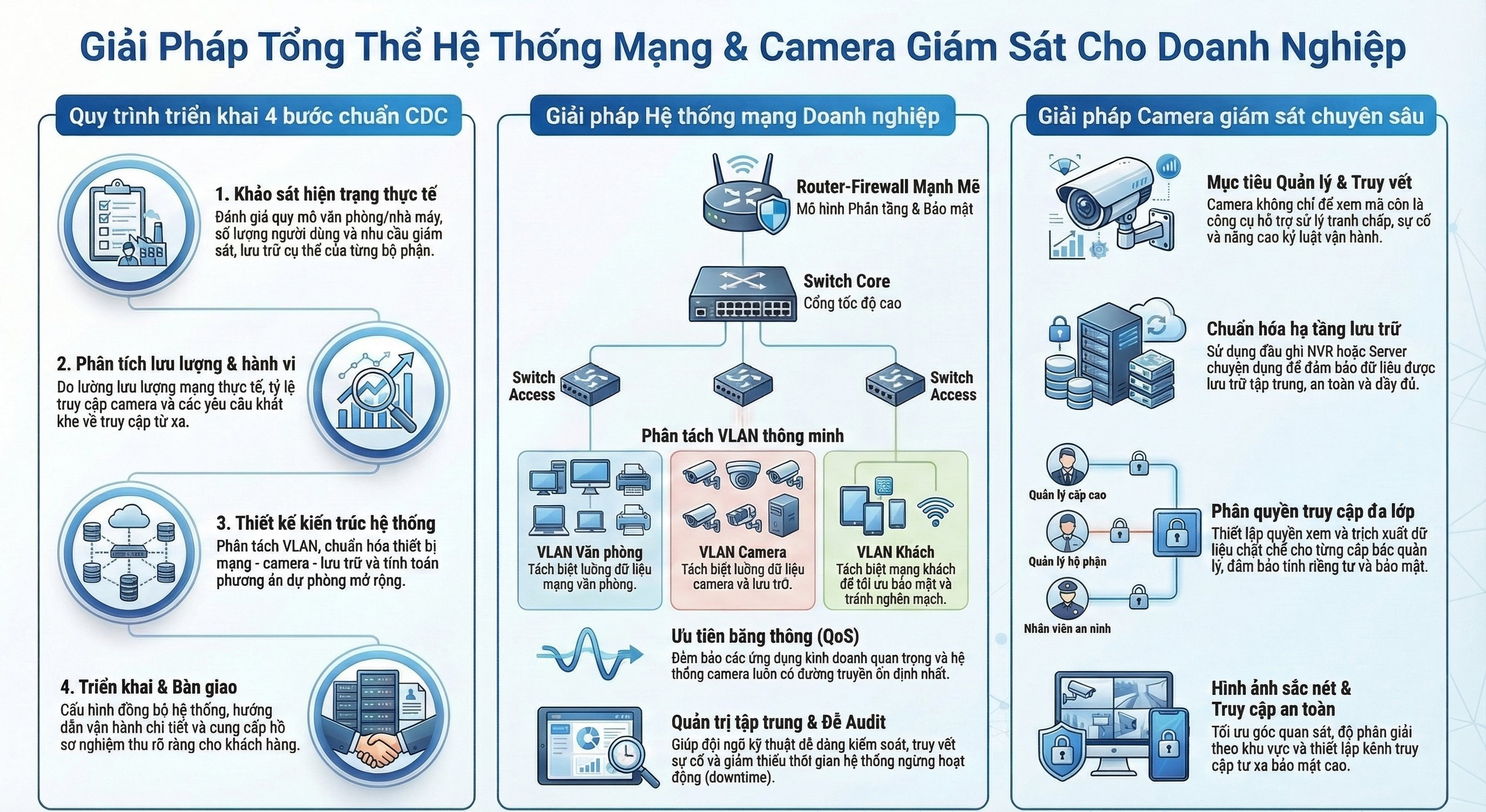 Trong môi trường doanh nghiệp hiện đại, hệ thống mạng và camera giám sát không còn là hai hạng mục tách rời. Một hệ thống mạng yếu sẽ khiến camera giật, mất tín hiệu; ngược lại, camera triển khai không đúng sẽ gây quá tải hạ tầng, ảnh hưởng trực tiếp đến hoạt động kinh doanh. CDC Technologies triển khai giải pháp hệ thống mạng & camera giám sát theo mô hình vận hành thực tế, phù hợp cho doanh nghiệp SME, FDI, nhà máy, văn phòng đa chi nhánh – không bán thiết bị theo cấu hình lý thuyết.