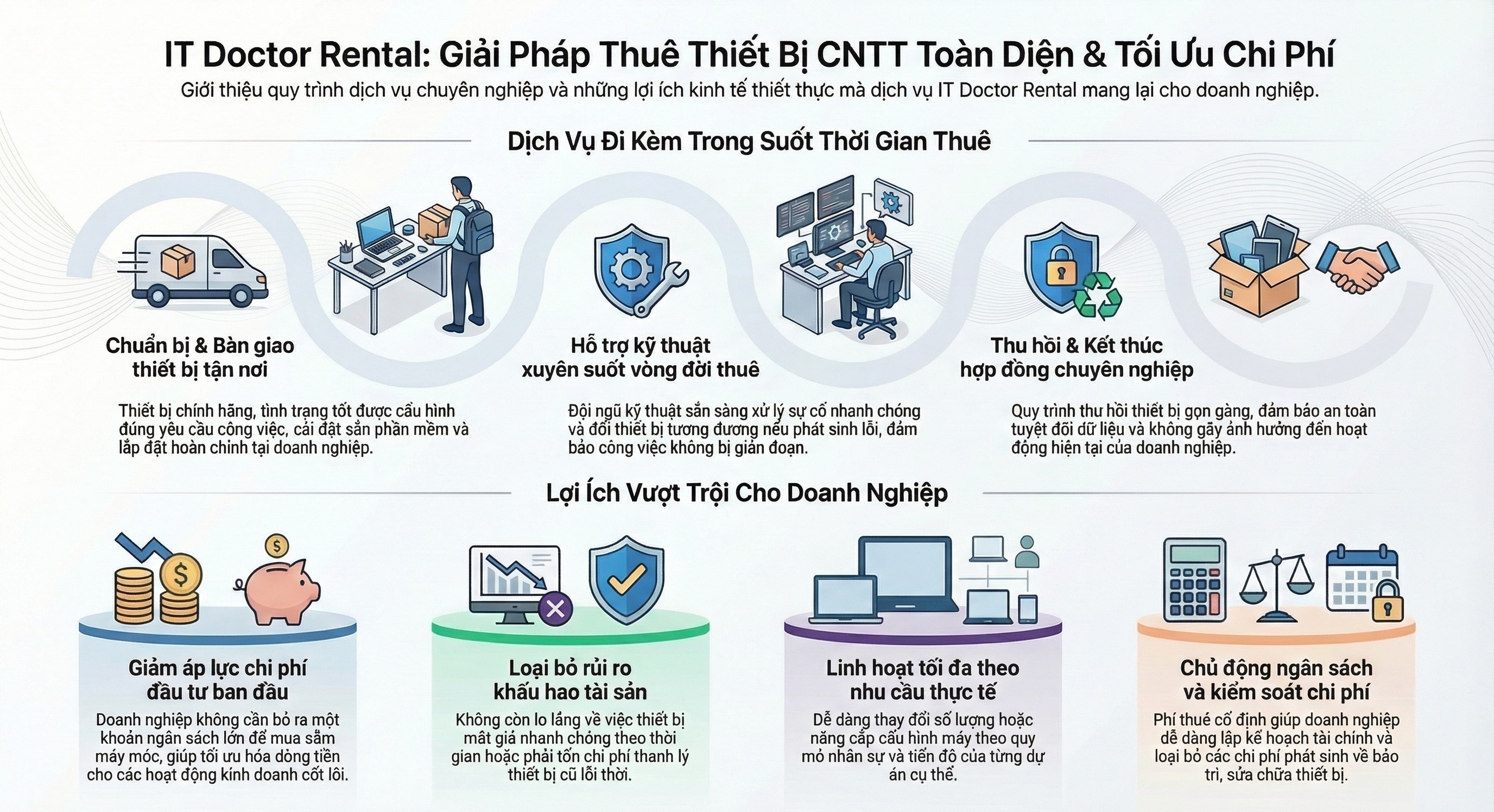 IT Doctor Rental không chỉ dừng lại ở việc cho thuê thiết bị, mà cung cấp dịch vụ trọn gói, giúp doanh nghiệp yên tâm vận hành.