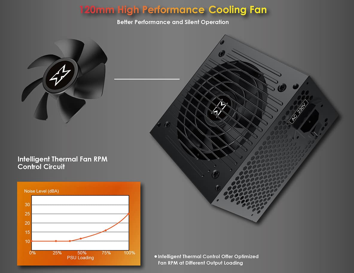 - Hiệu năng điện năng: đạt chuẩn 80 Plus White, cho thấy khả năng chuyển đổi năng lượng hiệu quả, tiết kiệm điện và hạn chế tỏa nhiệt dư.