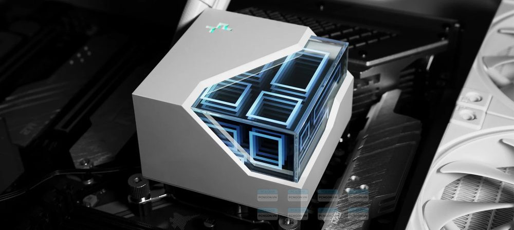 Điểm gây ấn tượng đầu tiên trên LT520 WH chính là phần block làm mát. Deepcool đã tạo nên một mặt block dạng gương phản xạ 3D nhiều lớp cho hiệu ứng thị giác rất khác biệt: ánh sáng ARGB không chỉ tỏa ra mà còn “ăn sâu” vào lõi gương, tạo cảm giác không gian mở rộng như một khối lập phương phát sáng.