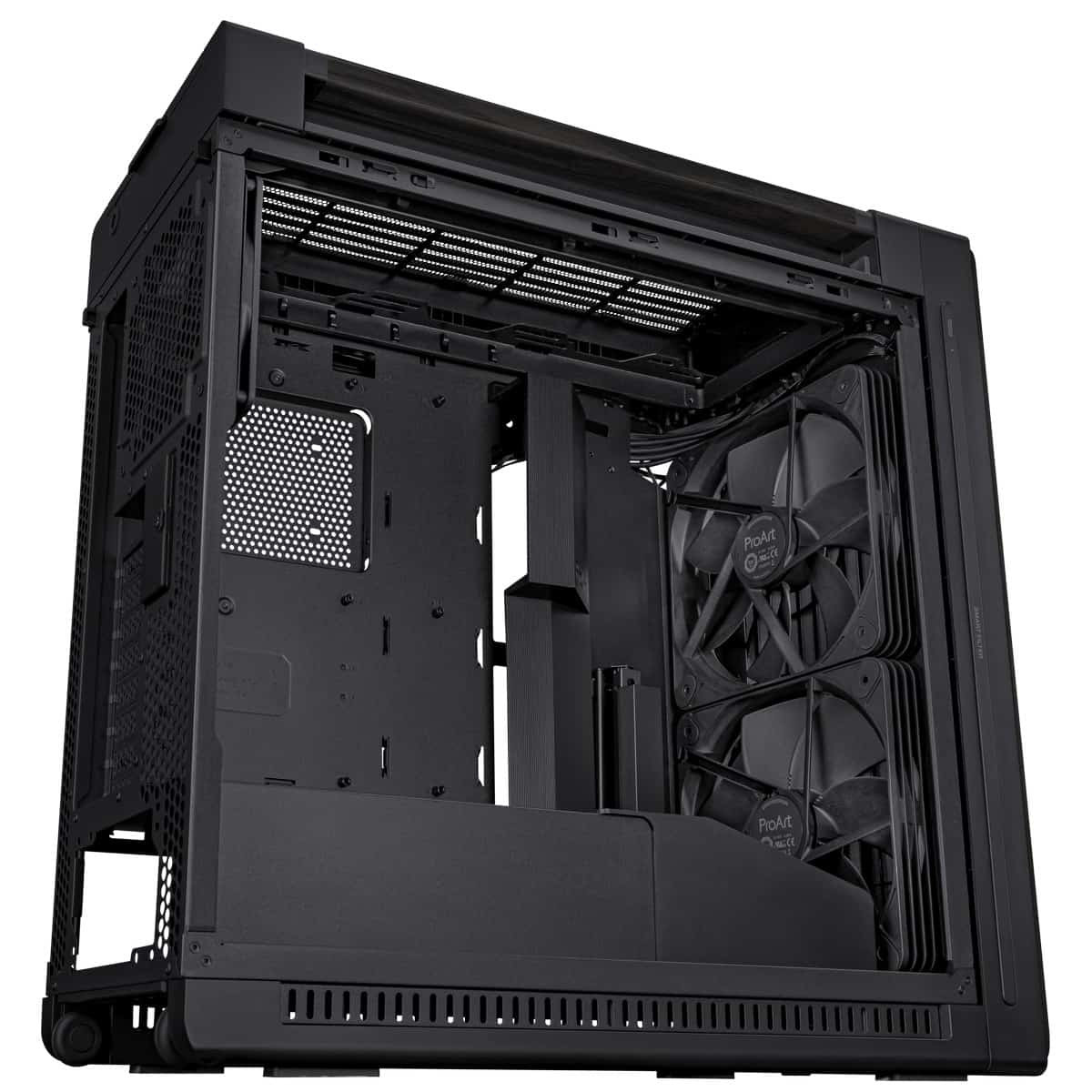Ngay từ cái nhìn đầu tiên, PA602 tạo cảm giác như một thiết bị trong studio chuyên nghiệp hơn là một chiếc case gaming thông thường. Phiên bản Black Wood sử dụng tông đen chủ đạo kết hợp với các điểm nhấn gỗ tự nhiên mang hơi hướng luxury, giữ đúng tinh thần “Art + Technology” của dòng ProArt.